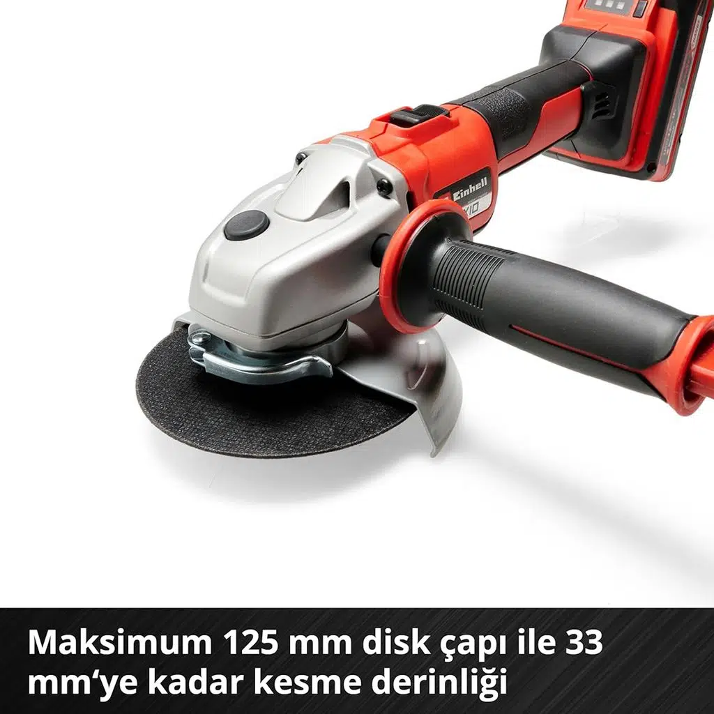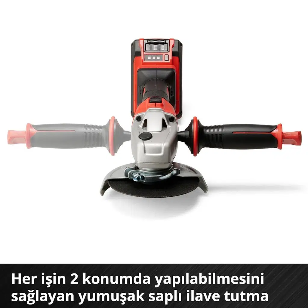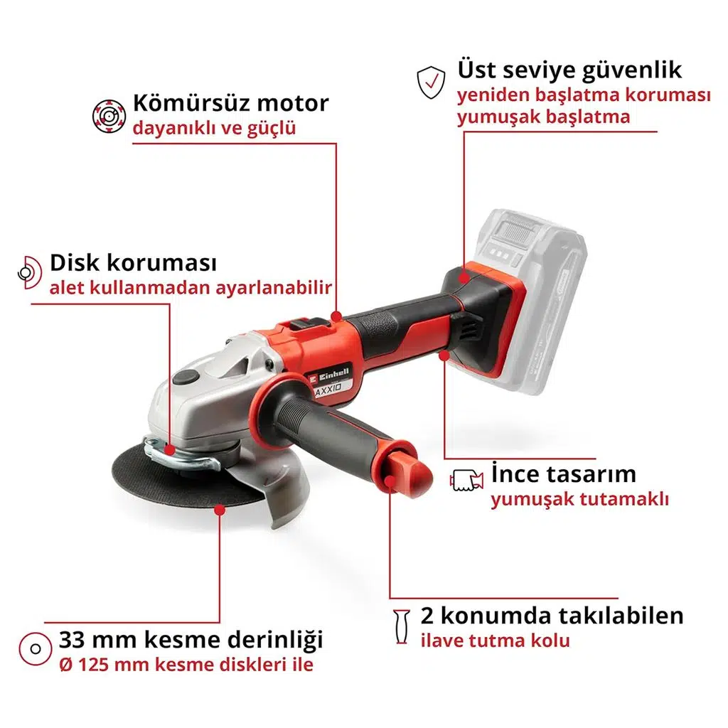 Einhell Axxio Akülü Avuç Taşlama, taşlama işleriniz için pratik bir araçtır. Kömürsüz motoru daha yüksek güç sağlarken geleneksel motorlara göre daha uzun çalışma süresi sunar. Yumuşak başlama(Soft start) ve yeniden başlama güvenlik özelliği ile güvenli bir kullanıma sahiptir. İnce dizaynı ve ergonomik yumuşak tutamağına ek olarak titreşim engelleyen tutamak ile konforlu bir çalışma sunar. Güvenli ve rahat çalışma için hızlı ayarlanır disk koruması özelliği bulunur. Daha rahat kullanım için ek tutamak 2 pozisyonda sabitlenerek kullanılabilir. Aşırı yük koruması ve dayanıklı alüminyum alaşımlı dişli gövdesi, uzun çalışma ömrü için tasarlanmıştır. Power X-Change ürün ailesinden olan Axxio, optimum bir çalışma için serinin daha yüksek performanslı 2,6 Ah Plus ve üstü akülerle kullanılması tavsiye edilir. Kesme diski dahil değildir. Einhell Axxio ürününde şarj cihazı ve akü bulunmamaktadır. İhtiyacınız olan ve dilediğiniz kapasitedeki aküleri ve şarj cihazını ayrı ayrı satın alabilir ya da daha önce satın aldığınız Power X-Change ailesi ürünlerinde bulunan akü ve şarj cihazlarını kullanabilirsiniz. Böylece her cihaz için tekrar tekrar akü ve şarj cihazı almak zorunda kalmaz ve tasarruf edersiniz.