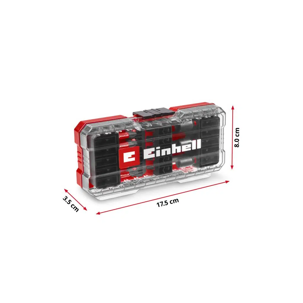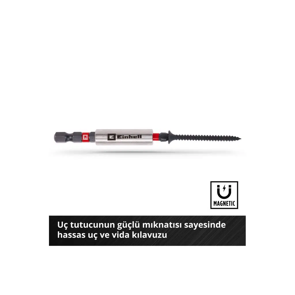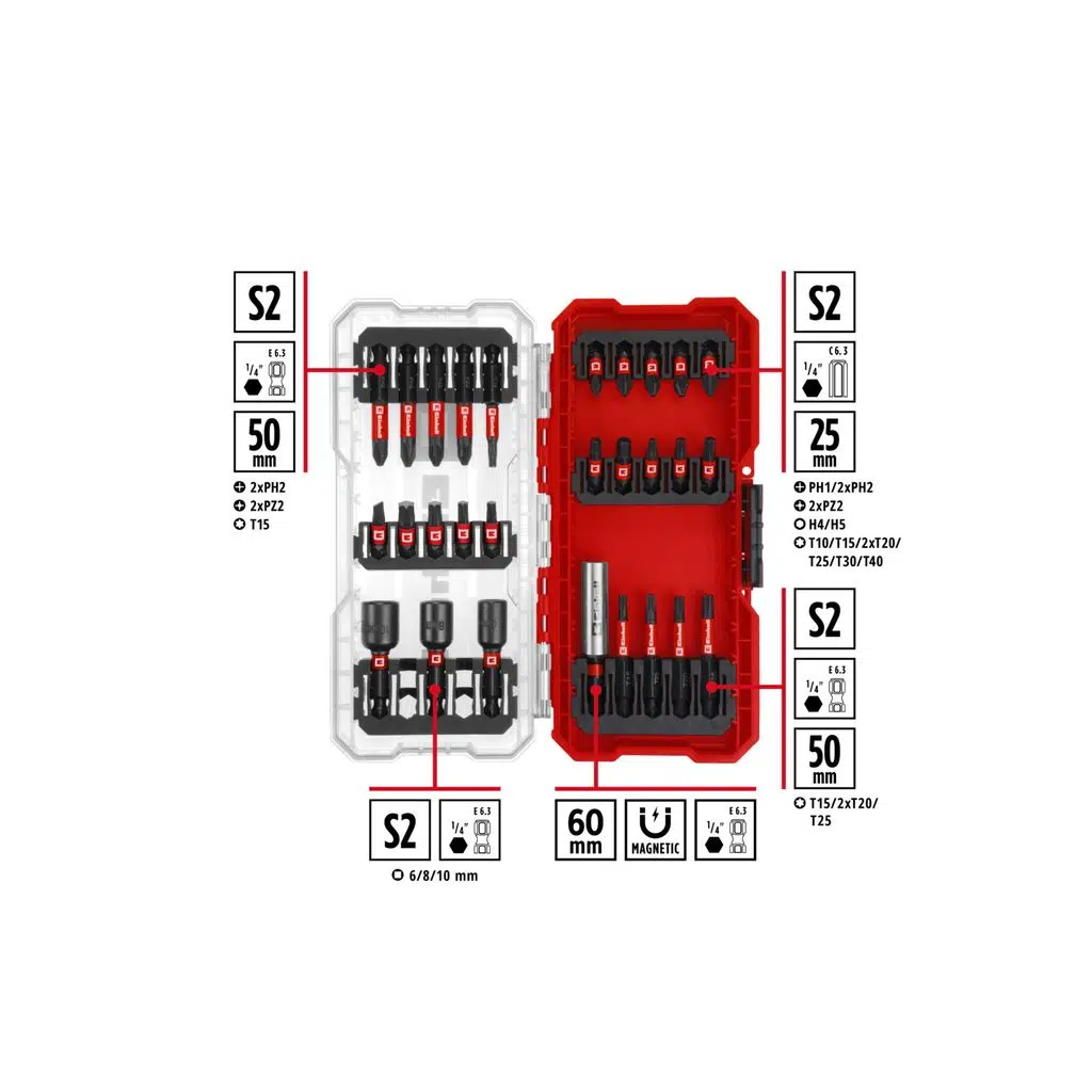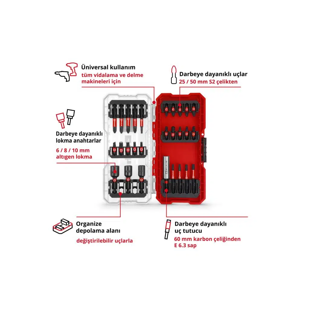 Darbeye dayanıklı uçlar – Uç setinde bulunan E6 6.3 şaftlı 25 mm uçlar ve sağlam, manganez fosfat S2 çelikten yapılmış E 6.3 şaftlı 50 mm uçlar uzun ömürlülüğü ile öne çıkar.;Darbeye dayanıklı lokma uçları – Einhell uç setinin manganez fosfat Krom vanadyum çelikten yapılmış lokma uçları zorlu görevler için uygundur.;Darbeye dayanıklı uç tutucu – Einhell setinin bir parçası olan paslanmaz çelik manşonlu ve E 6.3 saplı 60 mm uç tutucunun güçlü mıknatısı, uçların güvenli ve hassas bir şekilde yönlendirilmesini sağlar.;Pratik saklama kutusu – Düzenlenmiş Einhell Cases'in değiştirilebilir parçaları sayesinde doğru aksesuarlar her zaman elinizin altında ve düzenli bir şekilde saklanabilir.;Sağlam otomatik kilitli klips kapatma – Uç setinin otomatik kilitli klips kapatması, taşıma ve depolama sırasında S-CASE'in istenmeden açılmasını önler.;Şeffaf kapak – Şeffaf kapak ile Einhell aksesuar setinin tek tek parçaları bir bakışta görülebilir.;Markadan bağımsız – Piyasada bulunan akülü ve elektrikli darbeli matkap ve vidalama modelleri için uyumlu olan Einhell'in uç seti maksimum esneklik sunar.;Einhell'in 28 parçalı S-Case'i hem profesyonel zanaatkarların hem de iddialı DIY meraklılarının gereksinimlerine göre tasarlandı. Uç setinin tüm bileşenlerinin renk halkasında Einhell logosu bulunur. Toplamda Einhell seti, PH1 / 2x PH2 / 2x PZ2 / 2x T20 / T25 / T30 / T40 / SL5'te 25 mm uzunluğunda ve C 6,3 saplı 15 darbeye dayanıklı uç içerir. Ayrıca Einhell alet seti, 2x PH2 / 2x PZ2 / 2x T15 / 2x T20 / T25 dahil olmak üzere E 6.3 saplı 50 mm'de darbeye dayanıklı 9 uç sunar. Tüm uçlar, yüksek yükler altında bile dayanıklılık sağlayan sağlam S2 çelikten yapılmıştır. İlave manganez fosfat kaplaması aynı zamanda korozyona karşı da koruma sağlar. Ayrıca uç seti altıgen soketli, 6, 8 ve 10 mm boyutlarında üç adet darbeye dayanıklı lokma içerir. Bunlar, aşınma direncini ve uzun hizmet ömrünü vurgulayan sağlam, manganez fosfatlı krom vanadyumdan yapılmıştır. Einhell setine ayrıca 60 mm uzunluğunda, paslanmaz çelik manşonlu, darbeye dayanıklı bir uç tutucu da dahildir. Uç tutucunun E 6.3 sapı karbon çeliğinden yapılmıştır ve güvenli ve verimli uç kullanımı için güçlü bir mıknatısla donatılmıştır. Özel Einhell tasarımındaki pratik saklama kutusu, tüm aksesuarlar için değiştirilebilir parçalarla düzenli saklama alanı sunar. Şeffaf kapak, içindekilerin bir bakışta görülmesini mümkün kılarken, sağlam otomatik kilitli klips, kutunun güvenli bir şekilde kapatılmasını sağlar. Bu, uç setinin tüm bileşenlerinin her zaman elinizin altında olduğu anlamına gelir. Einhell'in 28 parçalı uç seti, piyasada satılan (darbeli) akülü darbeli vidalama ve matkaplar için uygundur sonuç olarak yüksek derecede esneklik sunar. Kaliteyi, çok yönlülüğü ve pratikliği hem profesyonellere hem de Kendin Yap meraklılarına uygun bir sette birleştiriyor."";Paket içeriğinde; "25 mm'de 15 adet darbeye dayanıklı uç (1xPH1 / 2xPH2 / 2xPZ2 / 2xT20 / 2xT25 / 2xT30 / 2xT40 / 2xSL5), 50 mm'de 9 adet darbeye dayanıklı uç (2xPH2 / 2xPZ2 / 2xT15 / 2xT25), 1adet darbeye dayanıklı uç tutucu (60 mm), 3 adet darbeye dayanıklı lokma ucu (6 / 8 / 10 mm), 1 adet saklama kutusu (17,5 x 8,0 x 3,5 cm) bulunmaktadır.