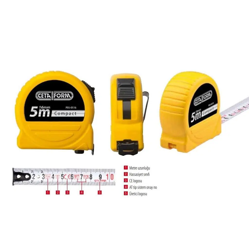 Ceta Form Compact Şerit Metre, kompakt ve dayanıklı yapısı sayesinde profesyonel kullanıcılar ve hobi amaçlı ölçüm yapanlar için ideal bir ölçüm aracıdır. 5 metre uzunluğundaki şerit ve 19 mm genişlik, hem hassas hem de kolay okunabilir ölçüm sağlar. Ergonomik tasarımı ile elde rahat tutuş sunar ve uzun süreli kullanımlarda konfor sağlar.