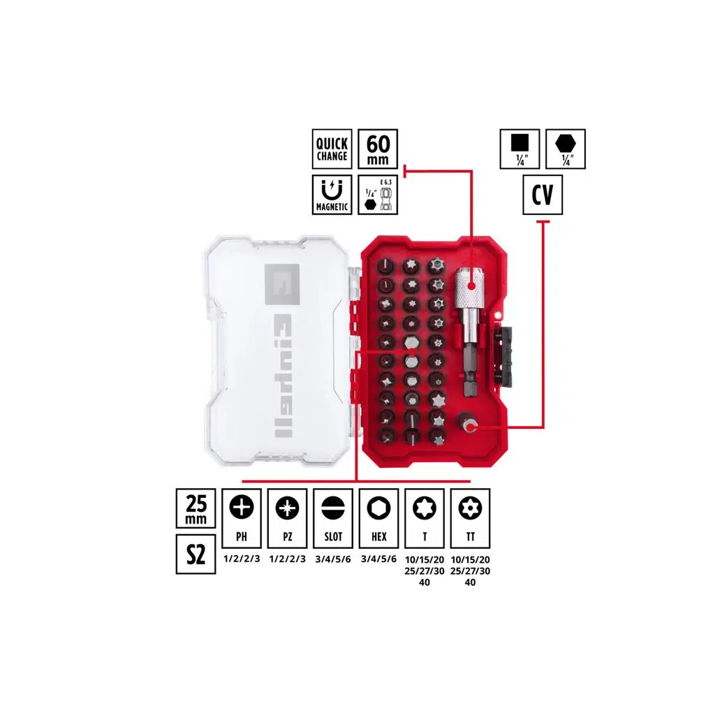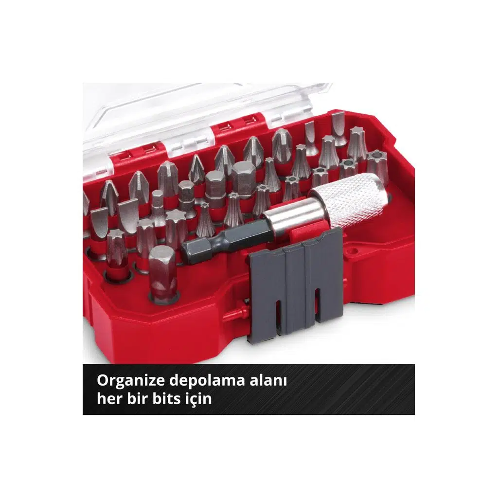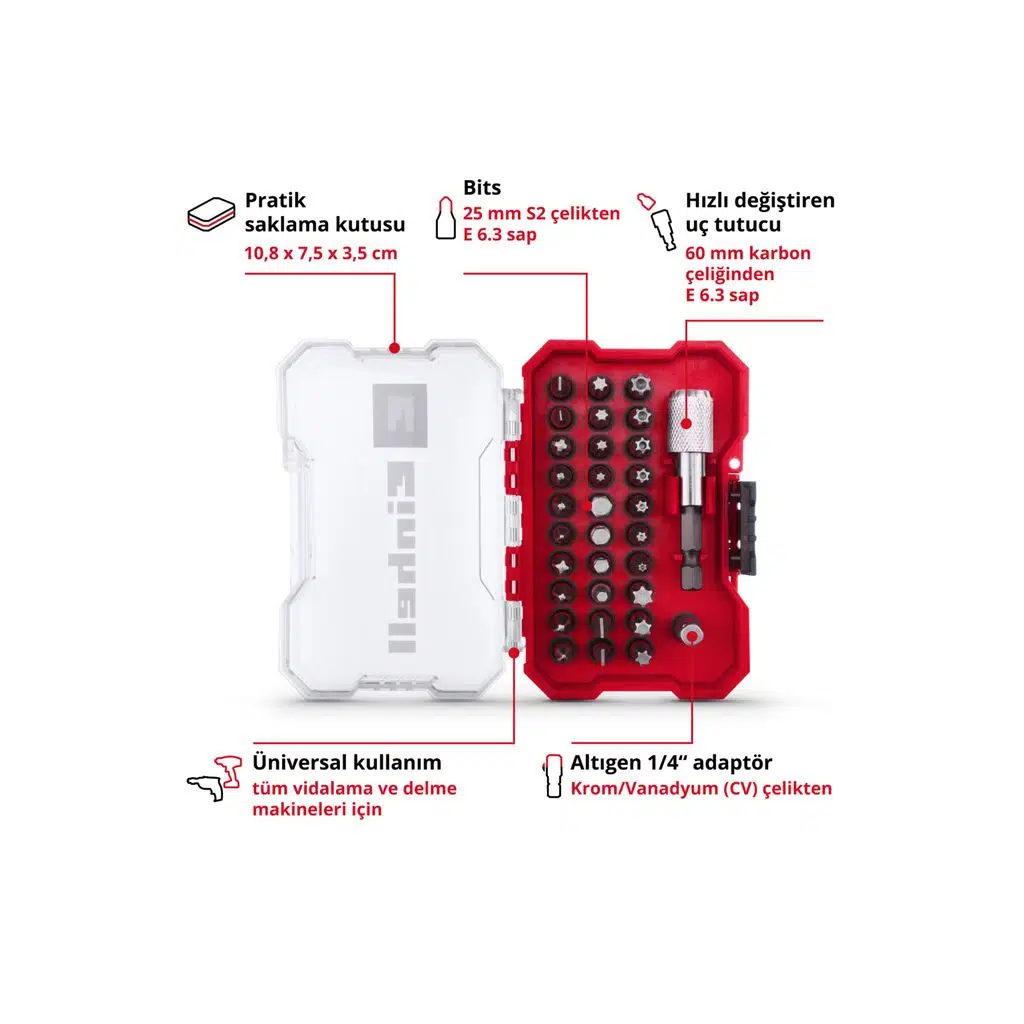 Einhell'in XS-CASE'i çok sayıda proje için ideal temel ekipman sunar ve piyasada bulunan akülü vidalama makineleri ve matkaplardaki tüm yaygın matkap mandrenleri ve uç tutucularla uyumludur. Uç seti, C 6.3 saplı, 25 mm'de 30 uç içerir. Saklama kutusu içerisinde PH1 / PH2 / PH2 / PH3 / PZ1 / PZ2 / PZ2 / PZ3 / SL3 / SL4 / SL5 / SL6 / H3 / H4 / H5 / H6 / T10 / T15 / T20 / T25 / T27 / T30 / T40 / TT10 / TT15 / TT20 / TT25 / TT27 / TT30 / TT40 bits uçları bulunmaktadır. Einhell setinin uçları, yüksek dayanıklılığı ve performansıyla bilinen gri kumlanmış S2 çelikten yapılmıştır. Uç setine ayrıca güçlü mıknatısı ile hızlı ve kolay uç değişimi sağlayan 60 mm uzunluğunda hızlı değiştirilebilir uç tutucu da dahildir. Uç tutucunun E 6.3 sapı dayanıklı karbon çeliğinden yapılmıştır. CV çelikten yapılmış altıgen ila ¼’’adaptördür. Einhell tasarımındaki pratik saklama kutusu, iyi organize edilmiş saklama alanıyla etkileyicidir. Sağlam otomatik kilitli klipsli kapak sayesinde alet seti güvenli bir şekilde yerinde kalır. Şeffaf kapak, her bir bileşene en uygun genel bakışı sağlar. Bu, kutuyu açmaya gerek kalmadan içindekilerin bir bakışta tanımlanmasına olanak tanır. Kompakt ama güçlü XS-CASE, farklı projelerin gerçekleştirilebileceği birinci sınıf araç seçimi sunar. Bu çok yönlülük onu evdeki, bahçedeki ve atölyedeki çok sayıda uygulama için vazgeçilmez bir uç seti haline getiriyor.