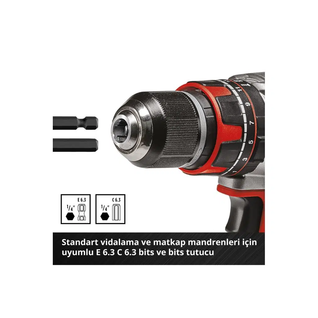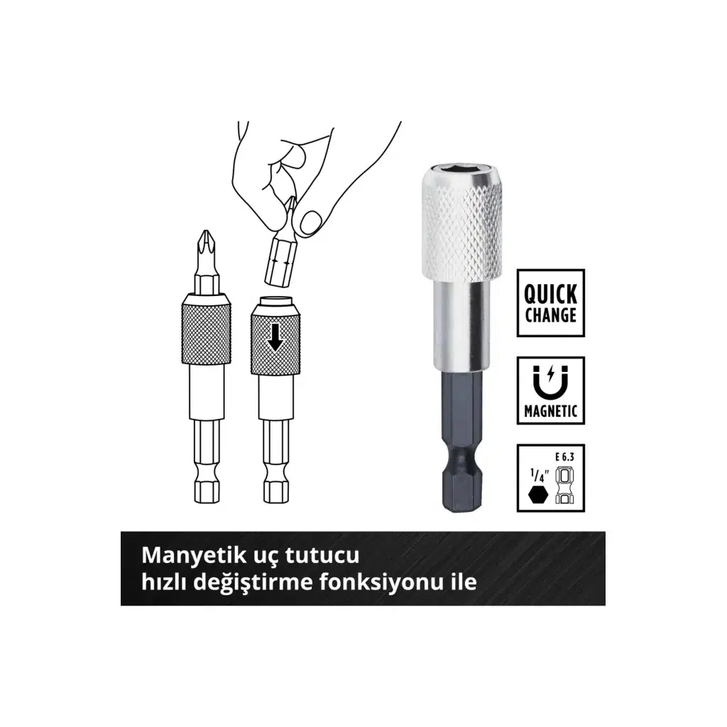 Hızlı değiştirilebilir uç tutucu – Einhell'in uç setini tamamlayan, karbon çeliğinden yapılmış 60 mm uzunluğunda hızlı değiştirilebilir uç tutucu, hızlı ve kolay uç değişimi sağlar.