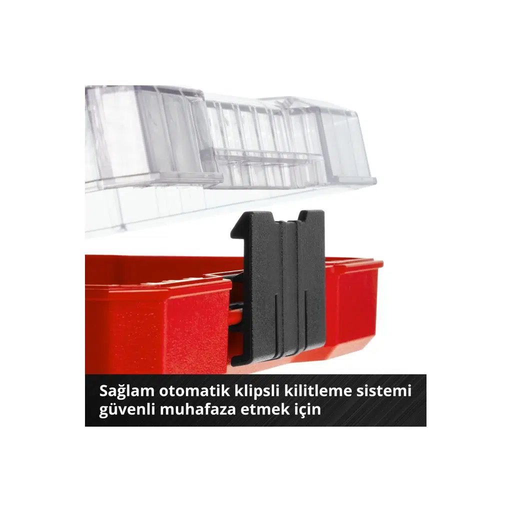 Pratik saklama kutusu – Einhell Kutusu, düzenli saklama alanı, sağlam otomatik kilitli klipsli kapak ve bileşenlere genel bakış için şeffaf kapak sunar.