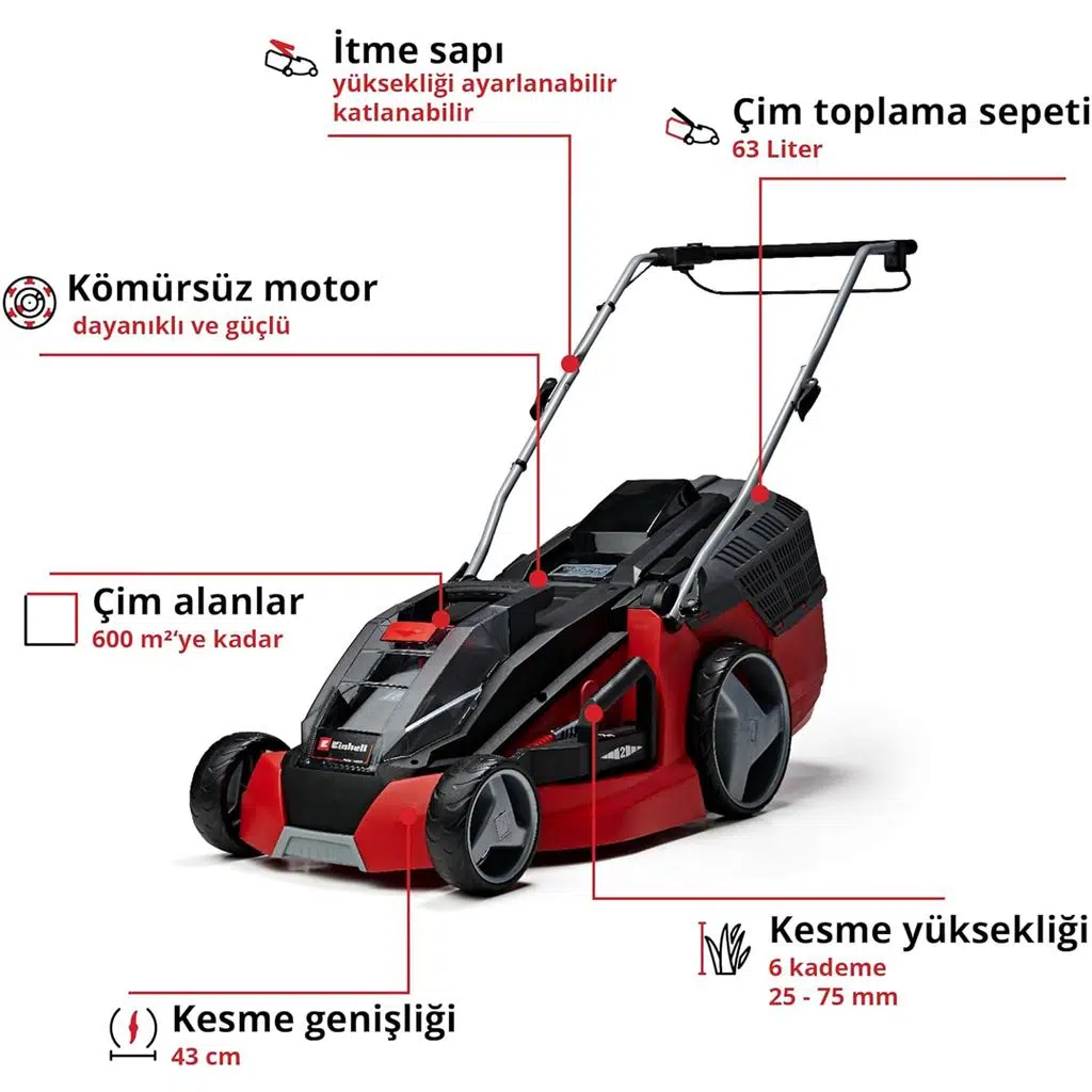 Bu ürün hakkında Power X-Change akü sistemi üyesi 3 LED'li akü şarj durumu göstergesi, akü diğer Power X-Change ürünleri ile birlikte kullanılabilir, 2 adet Power X-Change sistemi hızlı şarj cihazı, Einhell kömürsüz motor 6 kademe merkezi kesim yüksekliği ayarı, 3 kademe yükseklik ayarlı uzun tutamak; katlanır, uzun tutamak Entegre taşıma kulpu, yüksek tekerlekler, seviye göstergeli çim haznesi Yüksek kaliteli, darbe dayanımlı plastik gövde, malçlama kiti, 600 m² 'ye kadar olan çim alanlar için önerilir