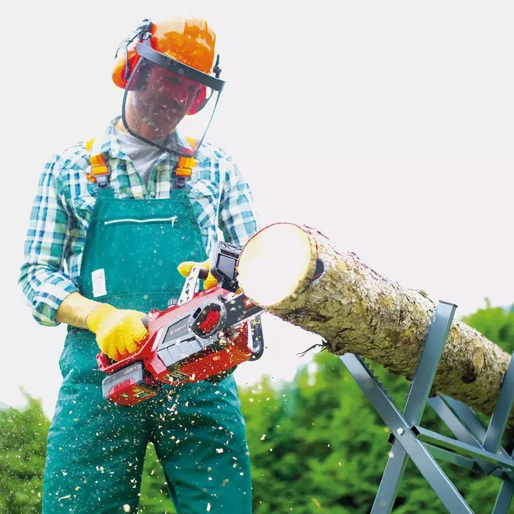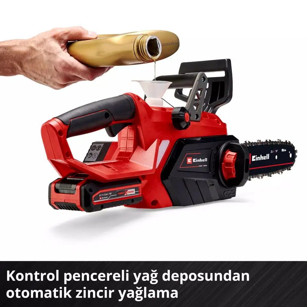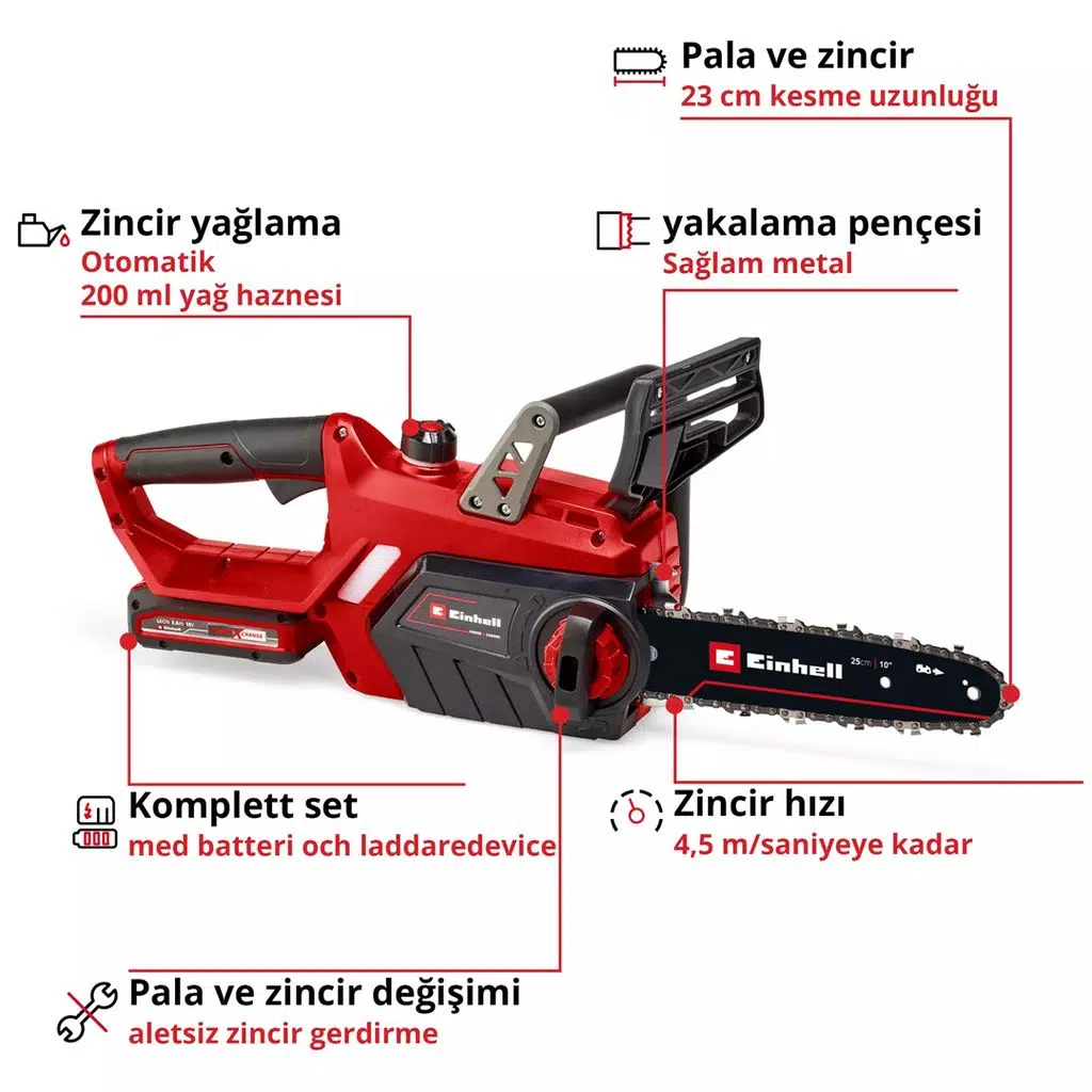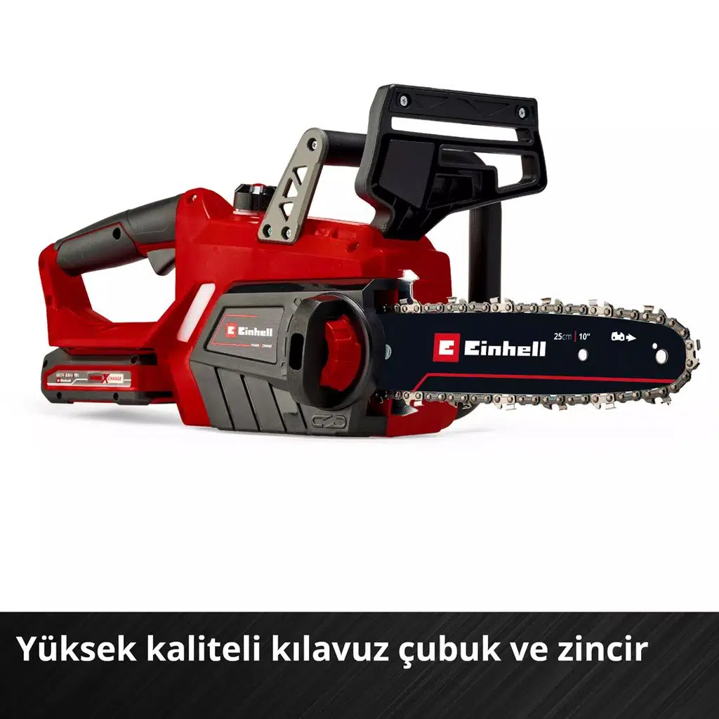 Einhell GE-LC 18/25-1 Li Kit (1x 3.0 Ah) akülü zincirli ağaç kesme testeresi, Power X-Change ailesine güçlü bir başlangıç veya genişleme için setteki tüm bileşenleri sağlar. Einhell'in akülü aletlerini kullanmak, hırslı DIY meraklılarının ve hobi bahçıvanlarının hareket yarıçapının neredeyse sınırsız olduğu anlamına gelir: Kablo karmaşası nedeniyle takılıp düşmek, çok kısa kablolar nedeniyle kısıtlamalar veya dikkatsizce uzatma kablosu aramak Power X-Change serisini kullanırken geçmişte kaldı. Ürün yelpazesindeki tüm cihazlar için tek bir akü, tek bir şarj cihazı kullanılabilir. Set, GE-LC 18/25-1 Li akülü, akülü zincir testereyi içeriyor: küçük ve orta boy ağaçları temizlemek ve kesmek, yakacak odun işlemek ve inşaat kerestesini kısaltmak ve kesmek için güvenilir bir araç. Kesme uzunluğu 23 cm olan motorlu testere, 1,1 mm zincir baklası kalınlığına, 40 zincir baklasına ve 3/8" zincir adımına sahip yüksek kaliteli bir zincirle donatılmıştır. Mekanik ani zincir frenli geri dönüşsüz koruma, kullanıcı için her zaman optimum güvenlik sağlar. Testere sıkıştığında derhal devreye girer, böylece zincir derhal durdurulur. Bir zincir yakalama cıvatası, zincirin atlaması durumunda zinciri durdurur. Sağlam metal pençe durdurucu, tüm çalışmalar sırasında güvenli ve rahat bir kılavuzluk sağlar, Einhell akülü motorlu testerenin ergonomik tutamağı ayrıca sağlam ve rahat bir tutuş sağlar. Zincir gerginliği herhangi bir alet kullanmadan ayarlanabilir ve zinciri değiştirmek için de alet gerekmez. Otomatik zincir yağlamanın yağ tankı, geniş yağ doldurma ağzı kullanılarak gerektiğinde kolayca doldurulabilir. Set, bir şarj cihazının yanı sıra 3.0 Ah Power X-Change akü içerir. Güçlü akü bir seviye göstergesi ile donatılmıştır. Akü şarjı üç LED üzerinden kolayca okunabilir. Bu sistem aküsü, Power X-Change cihaz ailesinin tüm üyeleriyle birlikte kullanılabilir. Hızlı şarj cihazı tüm Power X-Change aküleri için uygundur.