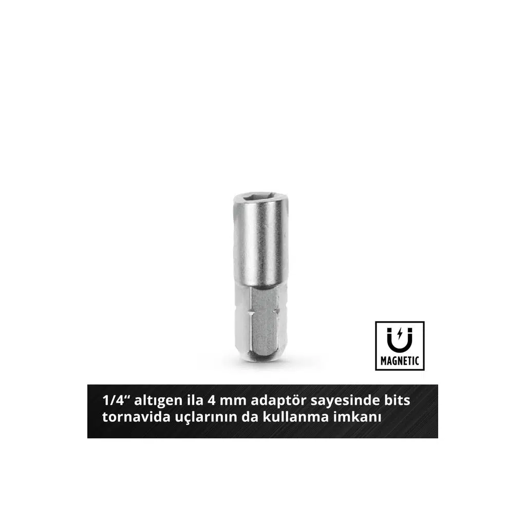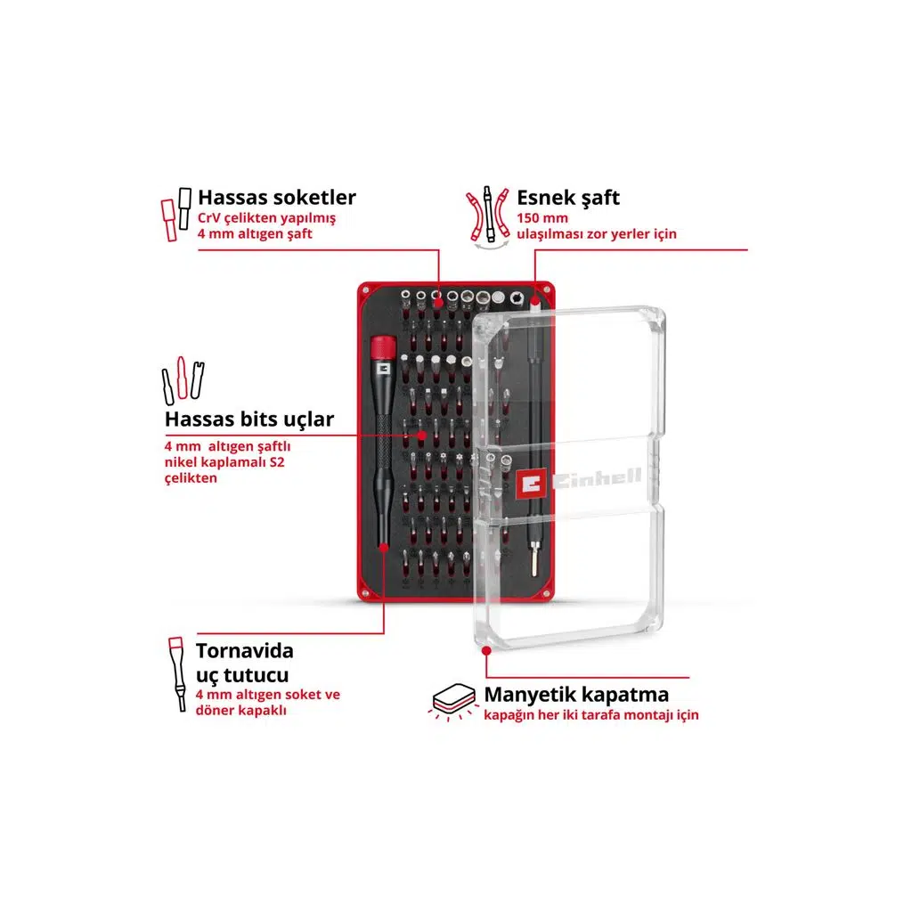Einhell'in 66 parçalı hassas seti, elektrikli cihazların hassas mekanik onarımları için idealdir. Set, metal parçaları çıkarmak için uç tutucuyla birlikte çubuk mıknatıs olarak kullanılabilen manyetik bir uç da dahil olmak üzere, 4 mm altıgen saplı S2 çelikten yapılmış 55 hassas uç içerir. Set ayrıca 4 mm altıgen saplı krom vanadyumdan yapılmış sekiz hassas lokma, krom vanadyumdan yapılmış 1/4" altıgen ila 4 mm adaptör ve 4 mm altıgen tutuculu ve döner kapaklı bir alüminyum tornavida ucu tutucusu içerir. Set Ulaşılması zor yerler için 150 mm uzunluğunda, esnek bir şaft uzatmasıyla yuvarlanır. Manyetik kapaklı pratik saklama kutusu, düzenli saklama alanı sağlar.