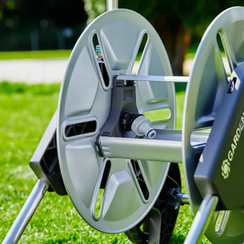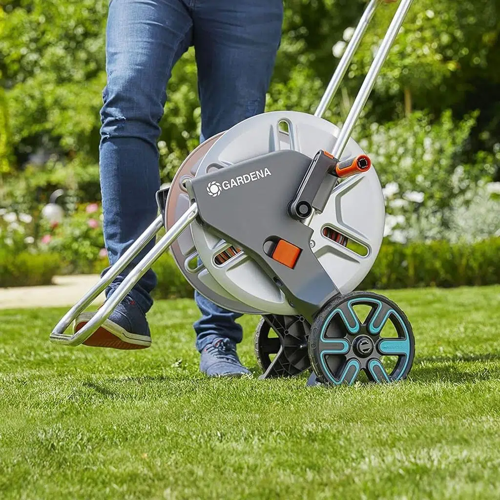 GARDENA Hortum Arabası CleverRoll M Metal özellikle sağlam ve dayanıklıdır ve bahçedeki en yüksek gerilime bile dayanabilir. Bahçe hortumunun yerden tasarruflu bir şekilde saklanmasını sağlar ve kullanımı kolaydır. Hortum, yumuşak plastik bileşenlere sahip ergonomik plastik çevirme kolu kullanılarak güvenilir bir şekilde sarılabilir. Katlanabilir ayak sayesinde artık devrilmez. Özel şekli ve tekerleklerin gözle görülür şekilde yüksek konumlandırılması da Hortum Arabasının ayakta durma güvenliğini destekleyebilir. Yerden tasarruf sağlayan saklama için ayak basitçe katlanır, kol indirilir ve çevirme kolu içeri katlanır.