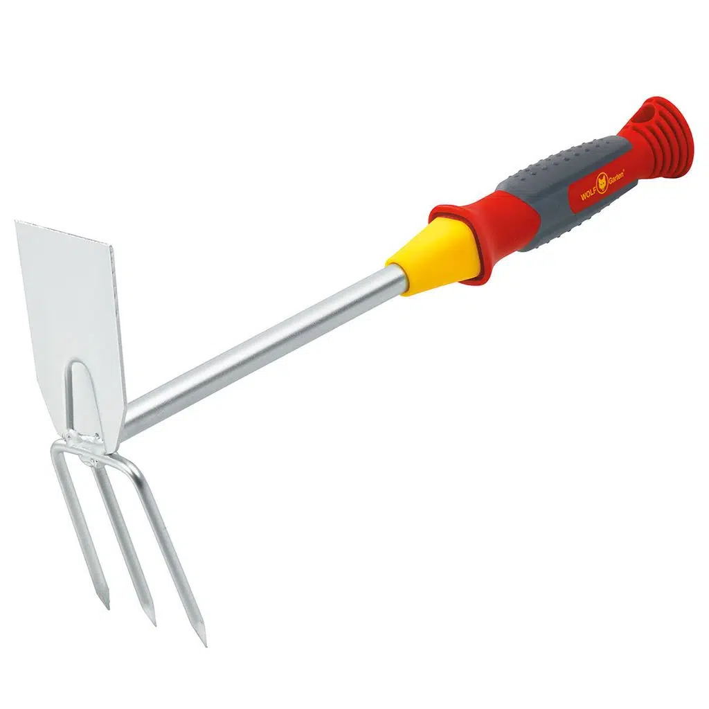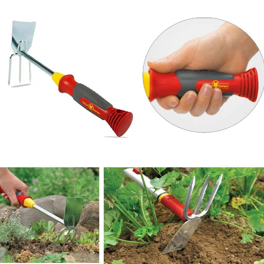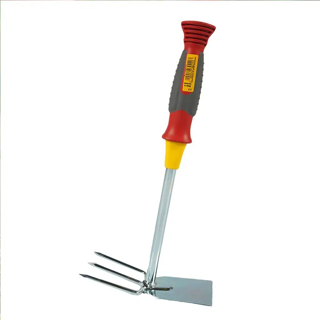 2'si 1 arada pratik el aleti; yaprakları kesmek, otları parçalamak, ayıklamak için keskin açılı bir bıçak ve sert toprağı gevşetmek için sivri uçlu dişlere sahiptir.