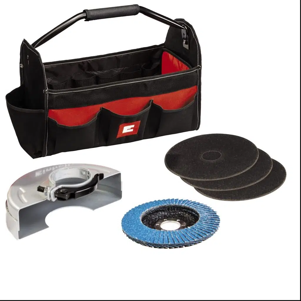 Hemen işe koyulabilmeniz için Einhell TC-AG 125/850 Kit avuç taşlama makinesin kapsamlı bir aksesuar setiyle birlikte verilir. Teslimat kapsamına Einhell 45/22 saklama ve taşıma çantası dahildir. Aksesuarlar arasında bir kesme diski koruması, üç adet kesme diski (125 x 1.2 mm) ve bir taşlama diski (125 mm) bulunmaktadır.