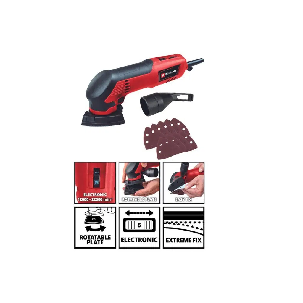 200 W Einhell delta zımpara TC-DS 20 E ahşap, plastik ve metal zımparalamak için kullanışlı, kompakt bir alettir. Uzun çalışma süresi ile üçgen zımpara makinesi, özel DIY kullanıcılarına iyi hizmet eder. Zımpara plakasının şekli özellikle köşeli, ulaşılması zor alanların zahmetsizce işlenmesi için uygundur ve delta zımpara plakası da buna yardımcı olmak için 3 konumda döndürülebilir. Zımpara pabucunun üç kenarının her biri 93 mm uzunluğundadır. Hız kontrol elektroniği, her görev için hassas güç uyarlaması sağlar. Zımpara makinesi 2 mm'lik bir salınım devresi ve 12.000 ile 22.000 rpm arasında bir salınım sayısı ile çalışır. Zımpara pabucu, çeşitli zımpara kağıtlarının saniyeler içinde değiştirilebildiği ve zımparalama sırasında güvenli bir şekilde sabit kaldığı Velcro sabitleme ile donatılmıştır. Ergonomik tasarım ve yumuşak kavrama, delta zımpara makinesinin elde en iyi ve sağlam şekilde durmasını sağlar. Temiz, tozsuz çalışma için, delta zımpara, ekstraksiyon için bir Einhell ıslak / kuru elektrikli süpürgeyi bağlamak için bir adaptöre (Ø 36 mm) sahiptir. Çalışmaya hemen başlayabilmeniz için 9 adet zımpara kağıdı (2x K60, 2x K120, 2x K240, 3x K400) teslimata dahildir. Sarmal kabloyu sabitlemek için kablo klipsi sayesinde delta zımpara her zaman düzgün ve güvenli bir şekilde saklanır.