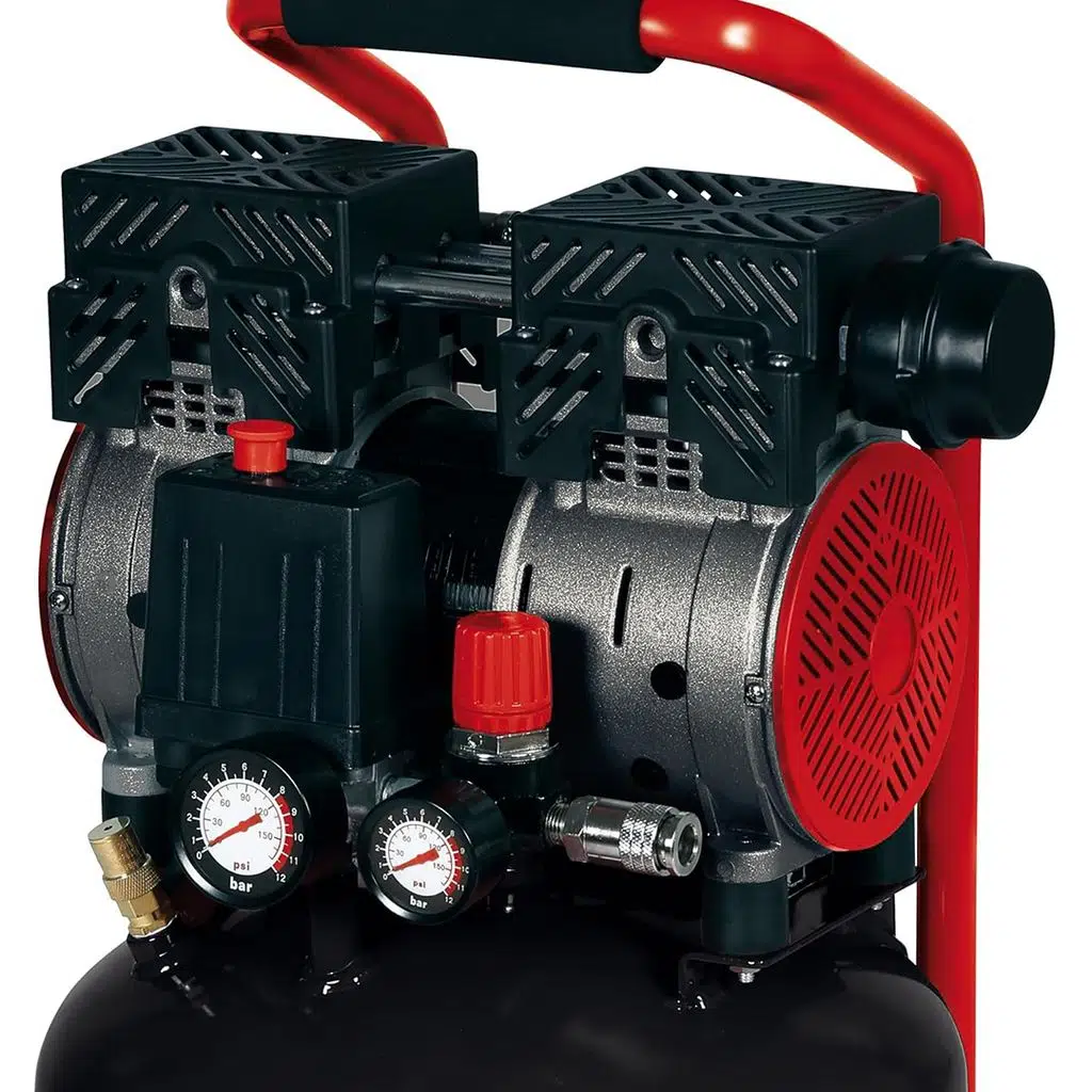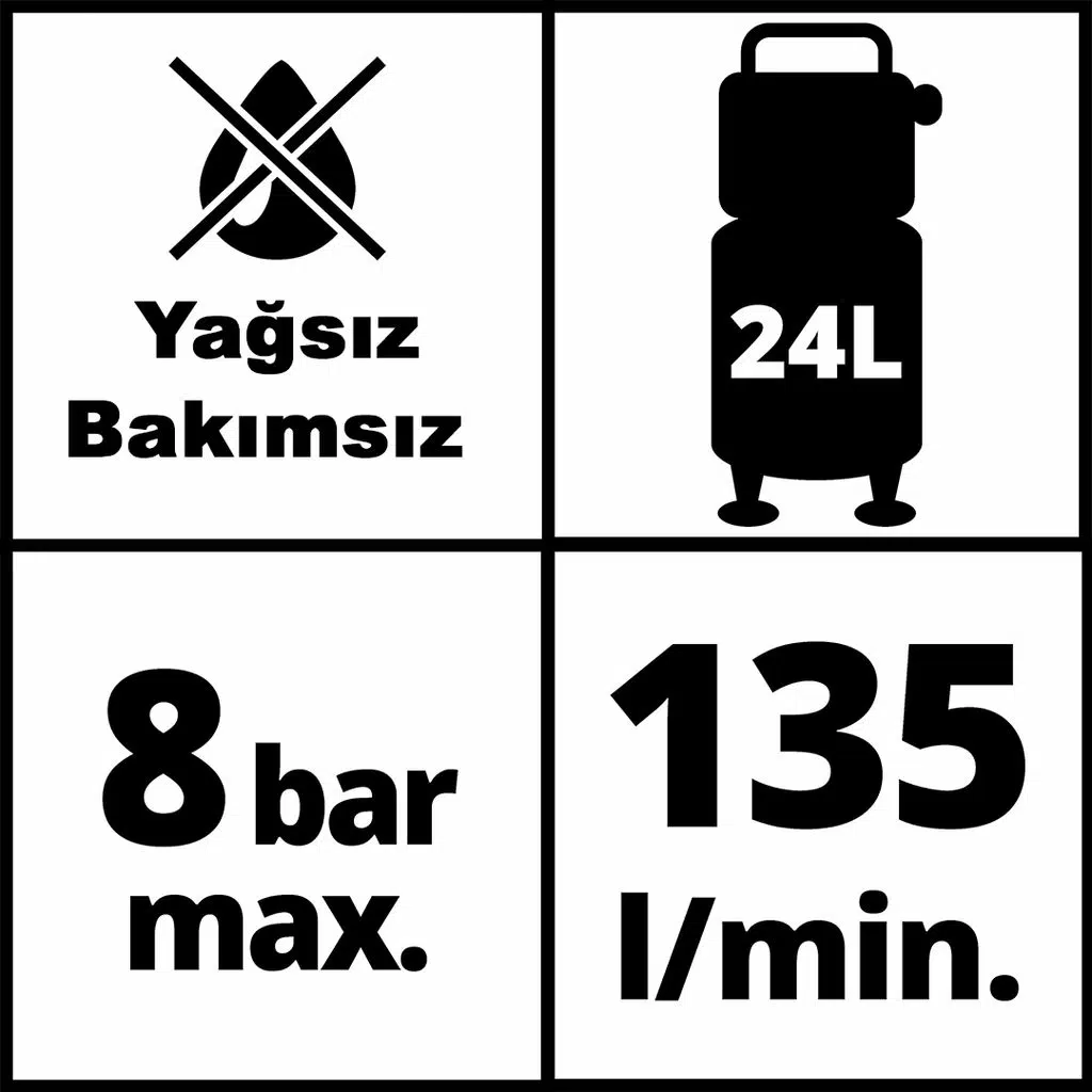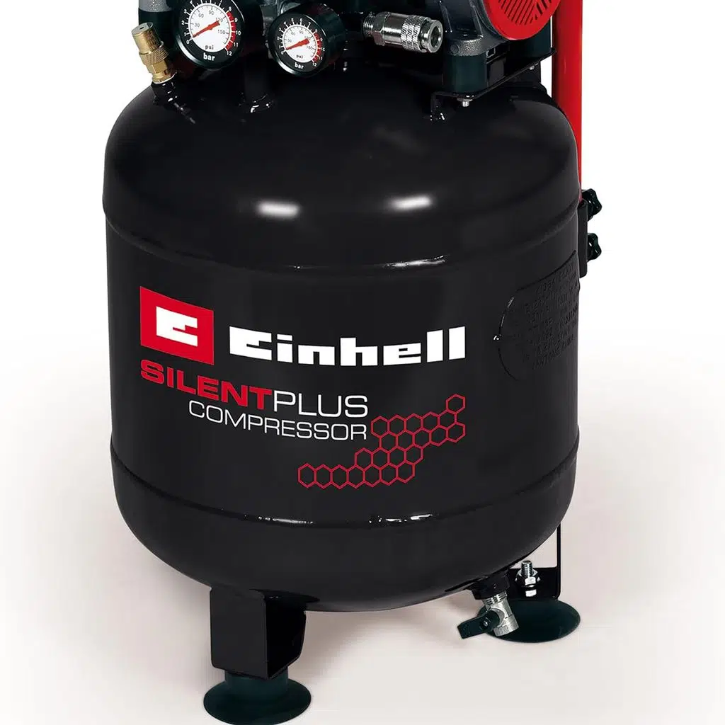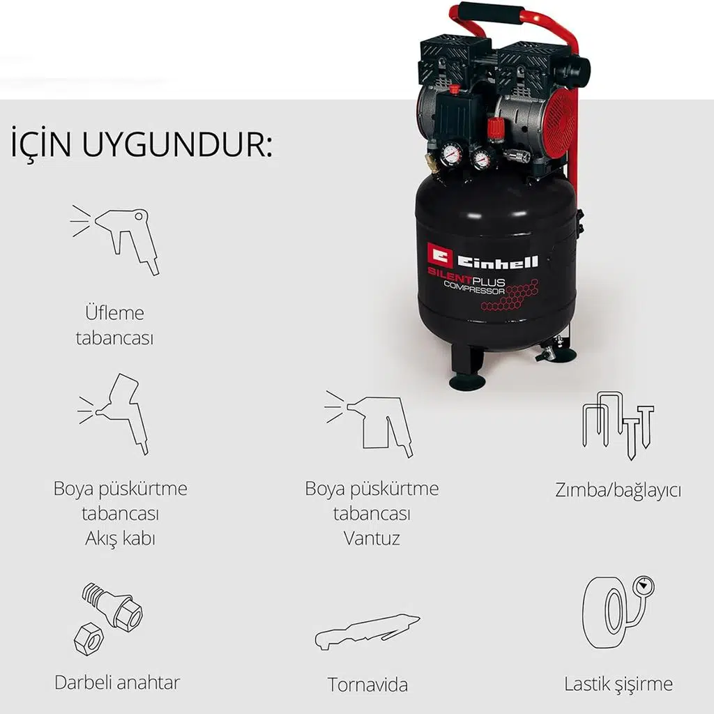 TE-AC 24 Silent kompresör garaj veya atölyeler için çok işlevli bir cihazdır. Bu sessiz kompresör, daha düşük gürültü seviyesi ile karakterize edilir, ancak 750 watt ile performanstan ödün vermez. 57dB (LpA değeri) ile kompresör, aynı performansa sahip geleneksel kompresörlerden önemli ölçüde daha sessizdir ve yağsız ve bakım gerektirmeyen bir motora sahiptir. Tahliye musluğu ile kompresörün bakımı kolayca sağlanır. 24 litrelik tank yeterli hava rezervi sağlar - doğru aletlerle boyaları ve vernikleri zaman kaybetmeden uygulamak veya geniş bir alana ya da yağ kullanarak hedeflenen bir şekilde ahşabı emprenye etmek için yeterli rezerv. Atölyede üfleme veya kumlama işleri de yapılabilir. Çok yönlü yardımcı, araba, motosiklet ve bisiklet lastiklerini, topları veya havalı yatakları zahmetsizce pompalar. Einhell tankın paslanmasına karşı on yıl garanti verir. 8 bara kadar bir çok uygulama için ayar imkanı sağlayan bir basınç düşürücüye sahiptir. Uygun çalışma basıncı için basınç saati ve hızlı bağlantı kaplini mevcuttur. Emniyet valfi kullanıcının güvenliğini sağlar. Ürünün düşük ağırlığı ve pratik tutma yeri de hareket kabiliyetini sağlar. Kompresör sadece birkaç basit adımda kolayca taşınabilir ve titreşim emici ayaklar, kullanım sırasında güvenli bir duruş sağlar.