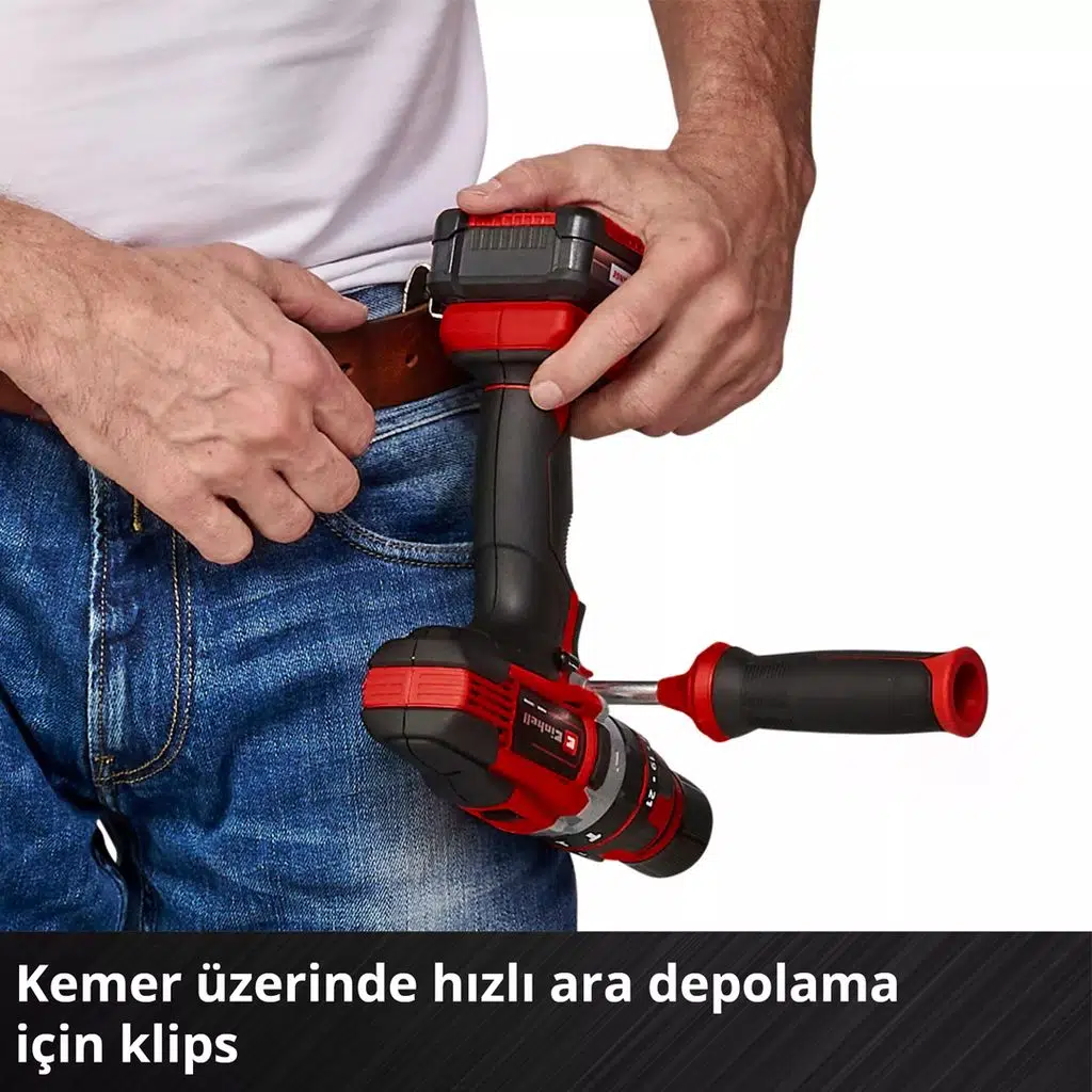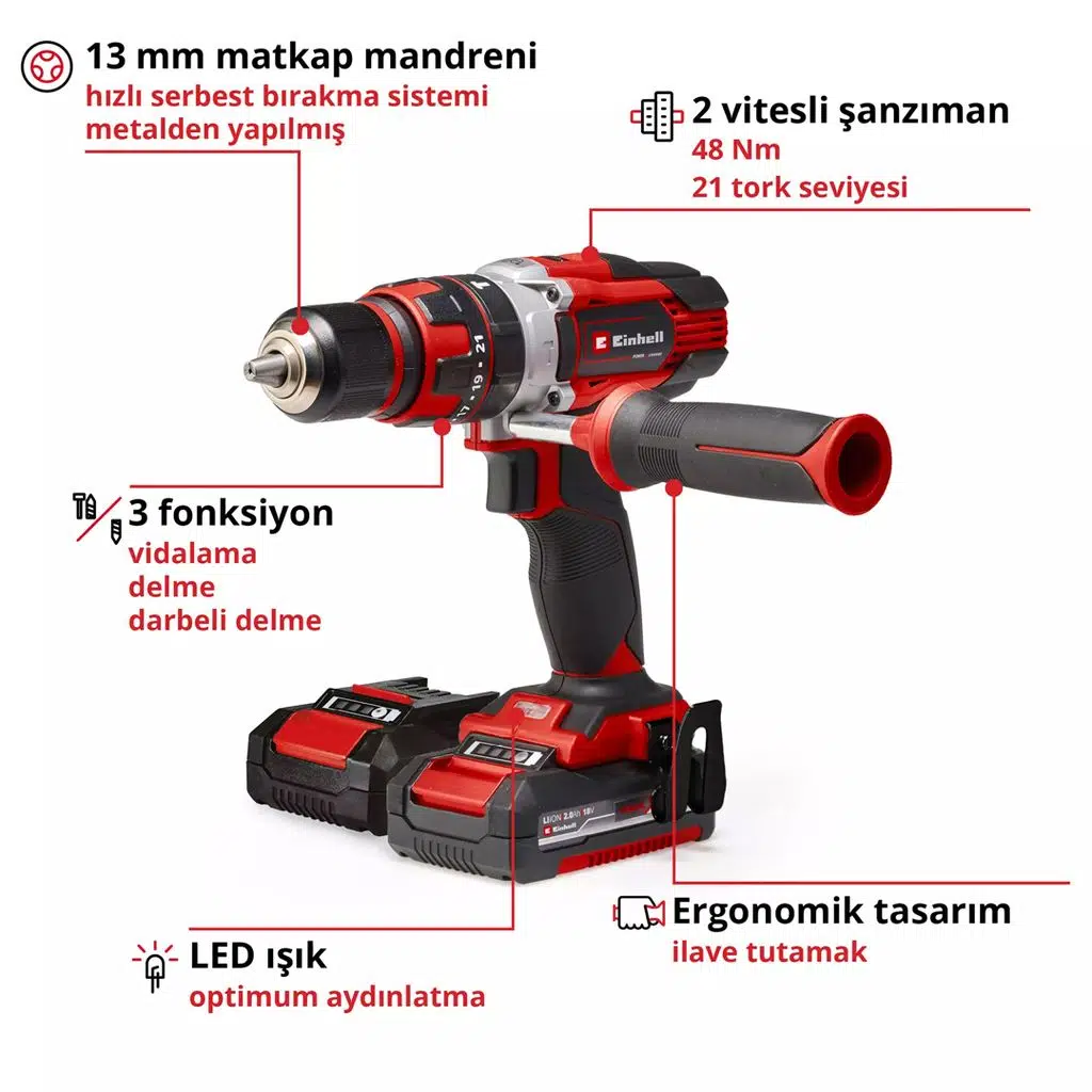 Einhell TE-CD 18/48 Li-i (2x2.0Ah) akülü darbeli matkap tam olarak ihtiyaç duyulan yerde nokta atışı hassasiyet ile güç sağlar: Restorasyon ve yenileme işlerinde taş ve tuğla gibi daha sert malzemeleri delmek için. Yüksek performanslı Power X-Change ailesinin bir üyesi olan darbeli matkap, gücünü PXC serisinin yüksek kaliteli lityum iyon şarj edilebilir akülerinden alır; her zaman kullanıma hazırdır ve normalde akülerde bulunan kendi kendine deşarj özelliği sıfırdır. Ürünle birlikte PXC serisinden iki adet 2,0 Ah şarj edilebilir akü ve bir şarj cihazı verilir. Sistem serisindeki şarj edilebilir aküler tamamen değiştirilebilir. Darbeli delme fonksiyonu sayesinde üniversal çalışma için tasarlanmıştır ve 2 vitesli dişli sistemi güçlü delme ve vidalama için uygundur. Elektronik hız kontrolü, tüm gücüne rağmen darbeli matkabın özel malzemeye ve uygulamaya göre ayarlanabilmesini sağlar. Ergonomik tasarım ve yumuşak kavrama sayesinde son derece kolay kullanım ve sağlam, güvenli bir tutuş sağlanır. Karanlık alanlarda bile çalışma alanının optimum şekilde görülebilmesi için bir LED ışık dahildir. Akülü darbeli matkap, şarj edilebilir aküleri ve şarj cihazıyla birlikte pratik bir taşıma ve saklama çantasında teslim edilir.