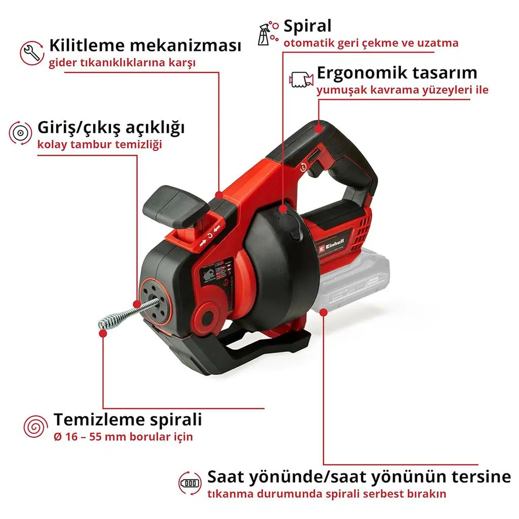 Einhell kablosuz boru temizleyici TE-DA 18/760 Li-Solo, boruların çok kısa sürede zahmetsizce akmasını sağlar. Boru temizleyicisi Power X-Change ailesinin bir üyesidir. Bu sistem serisindeki piller, cihazlar ve şarj cihazları birbirleriyle esnek bir şekilde birleştirilebilir. Tahrikli beslemeli basit geri çekme ve uzatma sayesinde temizleme işlemi temizdir. Saat yönünde ve saat yönünün tersine dönüş, daha büyük tıkanıklıkları da kolay ve verimli bir şekilde ortadan kaldırır. Galvanizli ve paslanmaz spiral, cihazın uzun ömürlü olmasını garanti eder. Tambur, giriş ve çıkış açıklıklarından rahatlıkla temizlenebilir. Kilitleme mekanizması inatçı kirlerin çıkarılmasını sağlar. Akülü boru temizleyici, 7 mm kalınlığındaki spiral sayesinde 16 ila 55 mm çapındaki borular için uygundur. Bir LED çalışma alanını aydınlatır. Yumuşak kavramalı ergonomik tasarım onu ??gerçekten kullanışlı kılar. Teslimata pil veya şarj cihazı dahil değildir. Bunlar ayrı olarak, örneğin pratik bir başlangıç ??seti olarak mevcuttur.