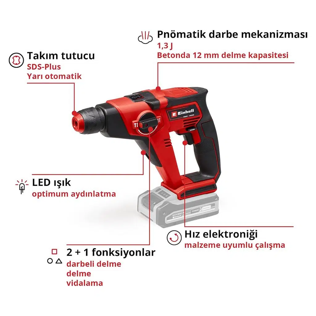 Einhell akülü kırıcı delici TE-HD 18/12 Li - Solo, çok amaçlı ve yüksek performanslı Power X-Change ailesinin güçlü bir üyesidir. Tüm PXC serisindeki aküler bu cihaz ile uyumludur. Akülü kırıcı-delici, iki temel fonksiyonu - delme ve darbeli delme - ile yeni başlayanlar ve deneyimli ustalar için malzemeye uygun işlerde güçlü bir yardımcıdır ve beton gibi zorlu malzemelerde güçlü delme için pnömatik darbe mekanizması mevcuttur. Yüksek tork için güçlü motor ve metal dişli sistemi vardır. Elektronik hız kontrolü, akülü kırıcı-delicinin malzeme ve yapılan işe uygun çalışmasını sağlar. Üniversal SDS-Plus mandren, yarı otomatik bir fonksiyonla ( çek-bırak ) donatılmıştır. Ergonomik tasarım ve yumuşak tutamak maksimum kullanışlılık ve sağlam, güvenli bir tutuş sağlar. LED aydınlatma, karanlık alanlarda optimum çalışma sunar. Teslimat içeriğine manyetik bits adaptörü dahildir. Akü ve şarj cihazı dahil değildir, örneğin pratik başlangıç seti ( starter kit ) ayrı olarak satılmaktadır.